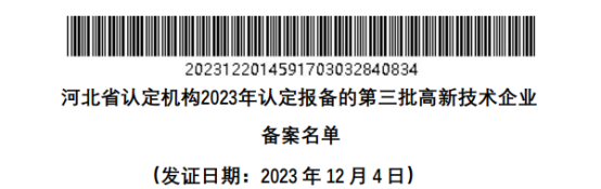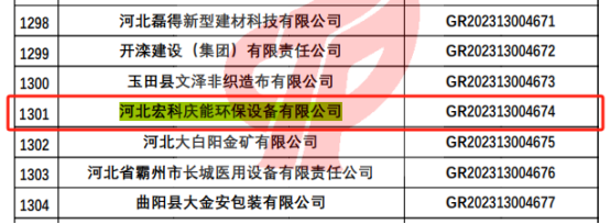 近日,全國高新技術(shù)企業(yè)認(rèn)定管理工作領(lǐng)導(dǎo)小組辦公室發(fā)布《河北省認(rèn)定機(jī)構(gòu)2023年認(rèn)定報(bào)備的第三批高新技術(shù)企業(yè)備案名單》,河北宏科慶能環(huán)保設(shè)備有限公司位列其中,公司正式邁入高新技術(shù)企業(yè)行列。